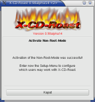 Kurulumdan sonra programı kullanıcı olarak çalıştırırsanız sizden önce 'root' olarak çalıştırıp normal kullanıcılar için kullanımı açmanızı isteyecektir. Alt+F2 tuşları ile bir komut penceresinden xcdroast programını root hakları ile çalıştırırız. |