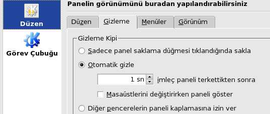 Daha sonra kendi alışkanlıklarınız ve istekleriniz doğrultusunda KDE'ye küçük ayarlar yapabilirsiniz. Ben alt çubuğun küçük ve 1sn içinde kaybolmasını isterim. Bunu çubuk üzerine sağ tıklayarak açılan ayar penceresinden kolaylıkla halledebilirsiniz.