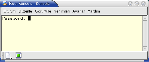 Burada kullanıcı ismi sorulmaz, yalnızca 'root' parolası girilmesi beklenir. Gerekli parolayı girdiğinizde 'root' olarak her türlü işlemi yapabilirsiniz. Text konsollarda olduğu gibi burada da parola girilirken basılan tuşların yerine hiçbir şey görüntülenmez. Dikkatli olmak gerekir.